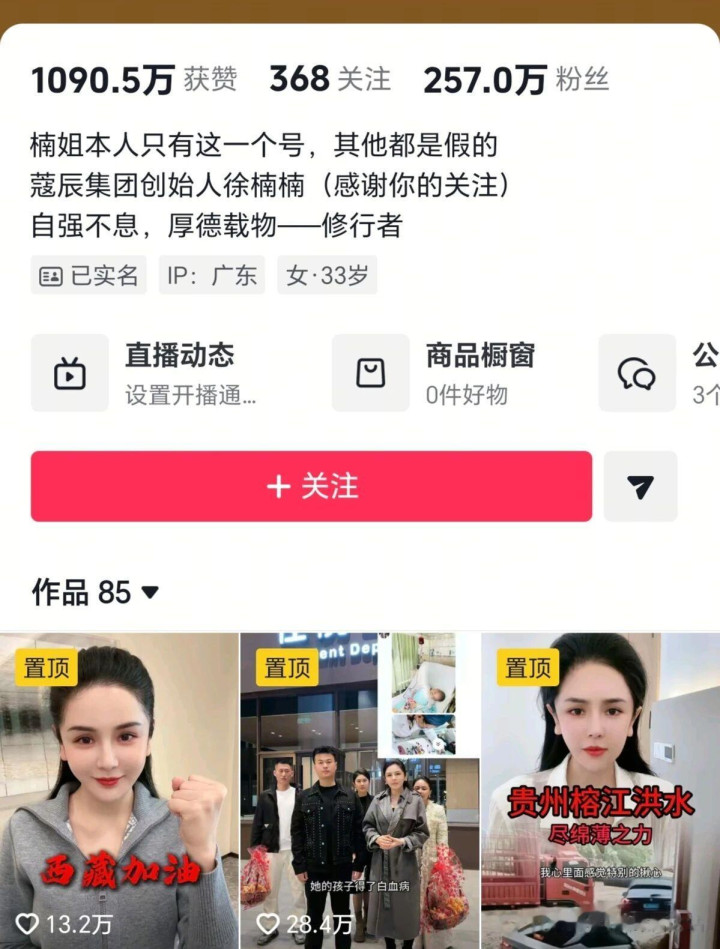 专门看了“楠姐”的账号,目前粉丝不过257万,但是她这并不是第一次捐款,曾经给贵州榕江捐款30万,给西藏捐款100万,得知一位单亲妈妈粉丝孩子得了白血病,亲自前往看望,并为其负担了医疗费用!